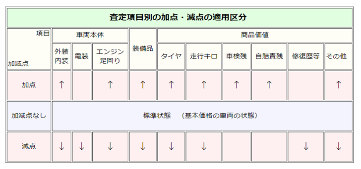 このモノサシに照らし合わせて、該当中古車の状態を比較し、各項目において加点減点する事になります。