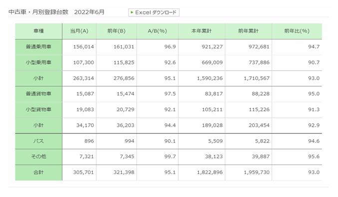 一般社団法人日本自動販売協会連合会が発表している中古車月別登録台数を以下にまとめました。