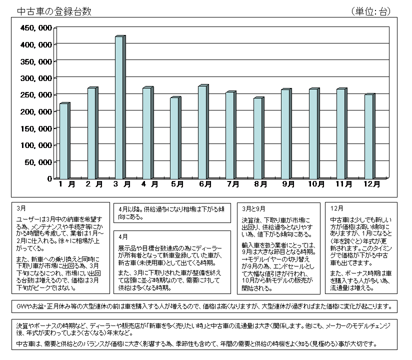 上記のグラフを見てもわかる通り、中古車の登録台数は3月に大幅に増加しています。逆に登録台数が一番少ないのは1月になっています。