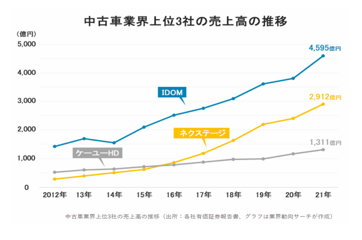 新車台数の落ち込みによって、すぐに入手可能な中古車に熱い視線が向けられるようになった結果です。以下は中古車大手3社の売り上げの伸びを現したグラフになります。