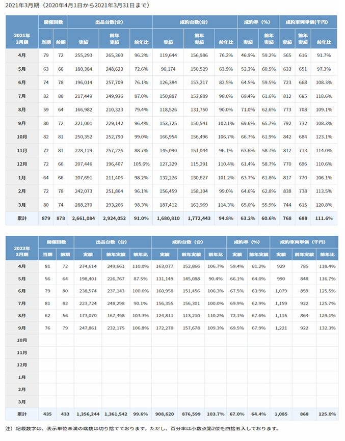 以下の表は、車買取り大手のUSS(車の買取り販売ラビット等を展開)の月次データになります。成約車両単価が軒並み上昇しているのが伺えます。