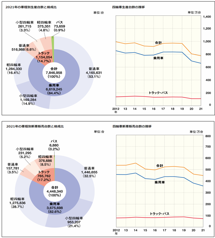 2021年の乗用車の生産台数は661万9千台と前年に比べて4.9%減になっています。販売台数で見ると、乗用車の販売台数は367万6千台と前年に比べて3.5%の減少になっています。