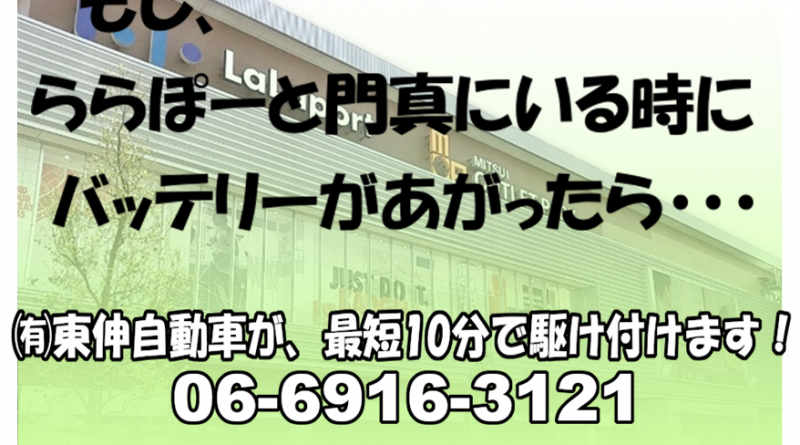 もし!ららぽーと門真店で車のバッテリーがあがったら⁉最短10分で門真の整備士がすぐに対応致します!