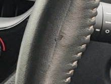 最初は「テカってきたかな」程度ですが、少しずつ皮の表面に擦れや破れが生じてきます。ステアリング(ハンドル)の傷みを気にして、ステアリング(ハンドル)カバー(ハンドルカバー)を使用されるお客さまもいらっしゃいますが、ステアリング(ハンドル)が本革巻きの場合カバーはNGです。カバーをすることで湿気等がこもり革の塗装が剥げてしまったり、また革本体にも剥がれが生じたりします。