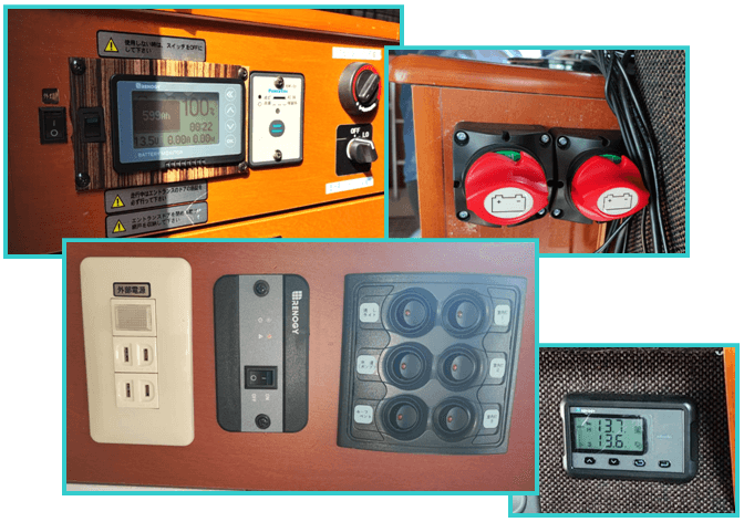 - バッテリーモニター(電圧計&電流計) →バッテリーの情報を観測する。残量が表示される。