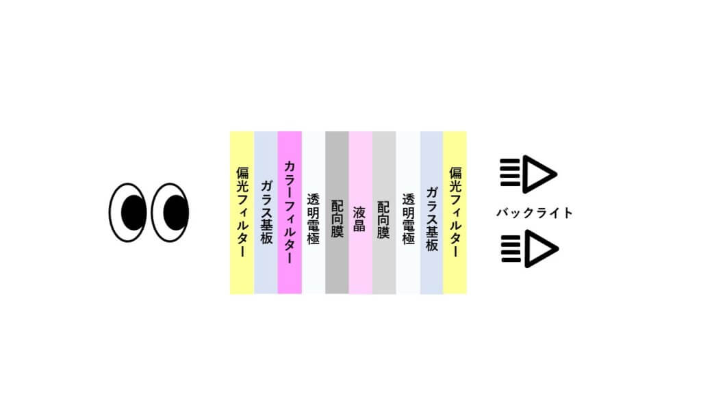 液晶パネルは、下図のように「偏光フィルター」という特定方向の光のみを通す部品のおかげで、文字を視認できる仕組みになっています。