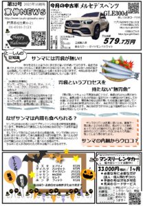 - 目次 - ●今月の中古車 メルセデスベンツ GLE300d 車両情報 車両装備・仕様 ●とーしんの豆知識 サンマには胃袋が無い!! 胃袋というプロセスを持たない“無胃魚” なぜサンマは内蔵も食べられる? サンマの内臓 […]