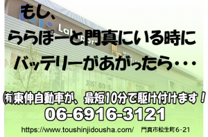もし!ららぽーと門真店で車のバッテリーがあがったら⁉最短10分で門真の整備士がすぐに対応致します!