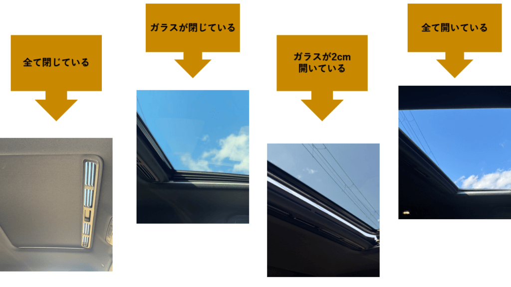 サンルーフは「全て閉じる」、「ガラスのみ」、「ガラスを2cm開ける」、「全て開ける」4つの状態に変化させることができます。