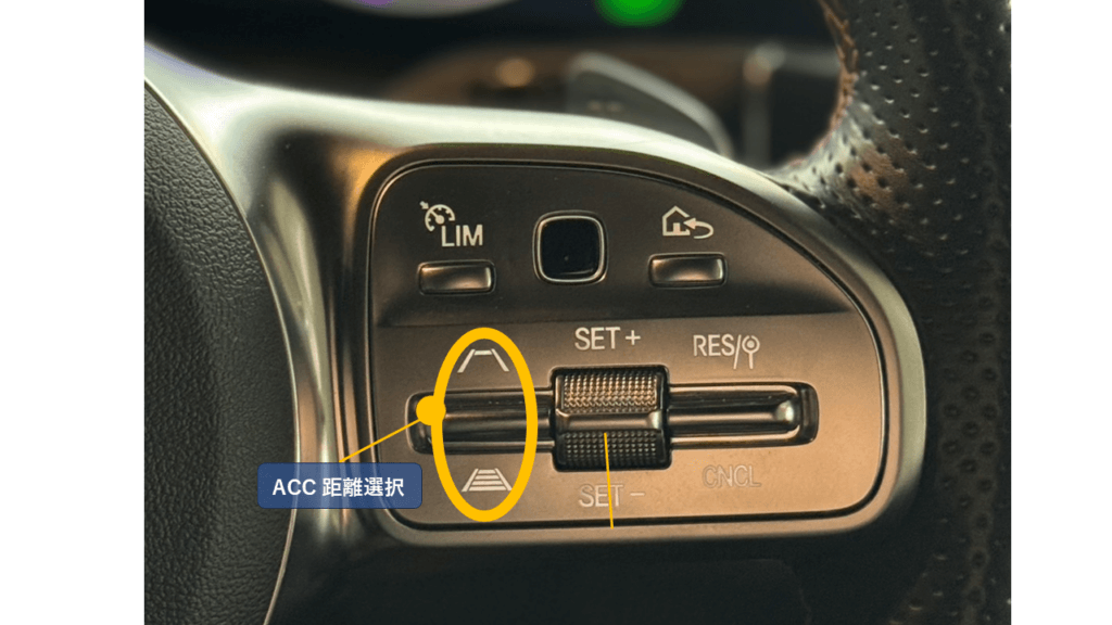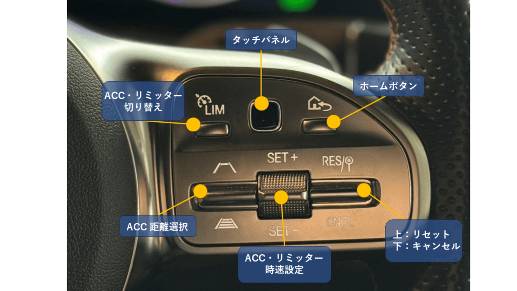 (ちなみにステアリングの下半分のボタンは、基本的に「リミッターとACC」の設定をする時に使用します。)