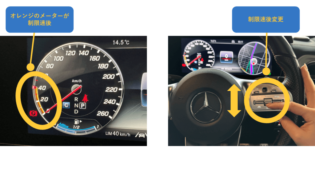 「LIM」と表示されたまま、ステアリング右下の「SET +-」を上下に押すことによって、リミッターの速度を変更することができます。