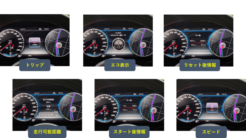 | ・トリップ ・走行可能距離 ・エコ表示 ・スタート後情報 ・リセット後情報 ・スピード |