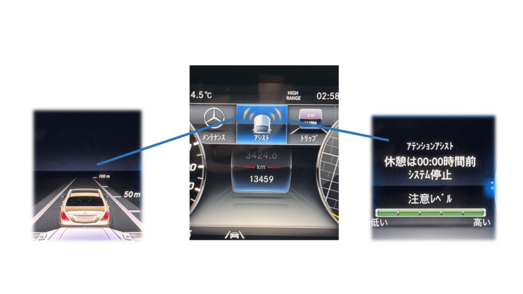 もう一つ、下に下げるとアテンションアシスト機能があります。休憩した時間を計測してくれており、休憩の注意レベルを表示してくれています。
