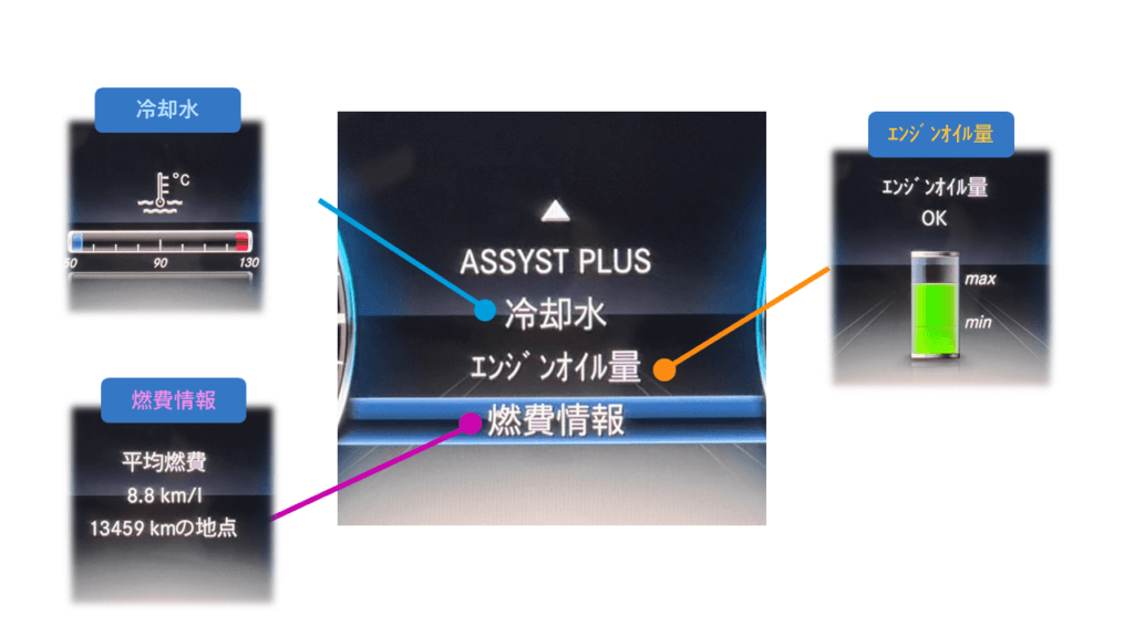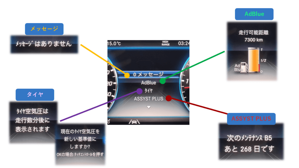 (メンテナンス内) ・メッセージ ・AdBlue ・タイヤ ・ASSYST PLUS ・冷却水 ・エンジンオイル量 ・燃費情報 |