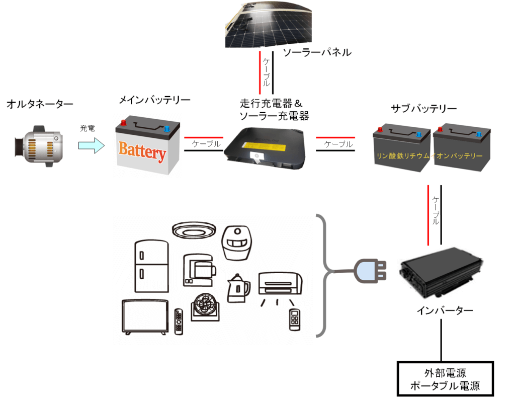 キャンピングカーで家電を使用する上で、ツインインバーターがどれだけ強みになるのかについて、少しだけ追記したいと思います。簡単ですが、以下がサブバッテリーシステムの概略図になります。