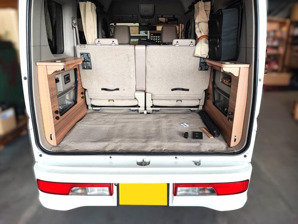 屋内コンセントは荷室左側面クォーター内側に取り付け致しました。屋外コンセント(定格100V15A)はリヤバンパー左側面に取り付けております。これでお客様のご要望通り、車中泊(キャンプ)を心置きなく楽しんで頂けるのではないでしょうか。