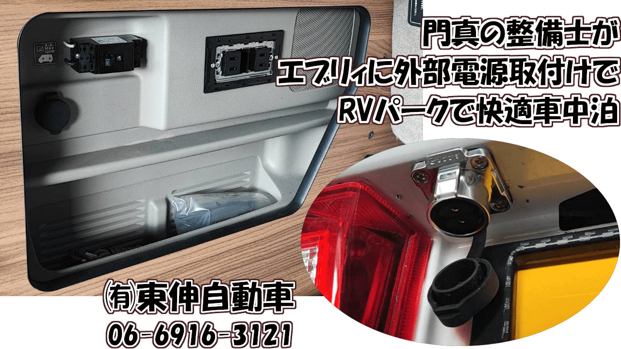 スズキ《エブリィ》DR17W 軽バンに大阪府門真市の整備工場が外部電源取付け!! RVパークで車中泊・キャンピングを快適に!!自動車の車内にACコンセントを取り付ける!