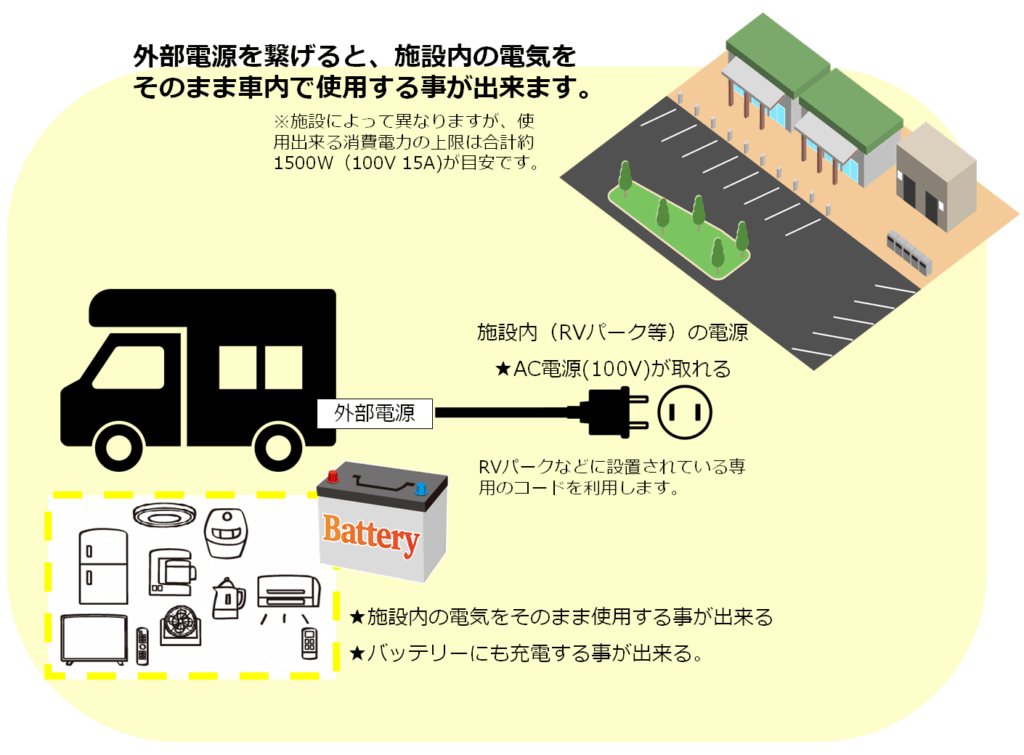 「外部」と言うだけあって、電源は車両の外になります。主に自宅や宿泊施設(許可が必要な場合が殆どです)などで利用します。外部電源に接続している間は停車中でも大容量の電力を使用することが可能です。もしサブバッテリーを搭載している場合はサブバッテリーにも充電されます。