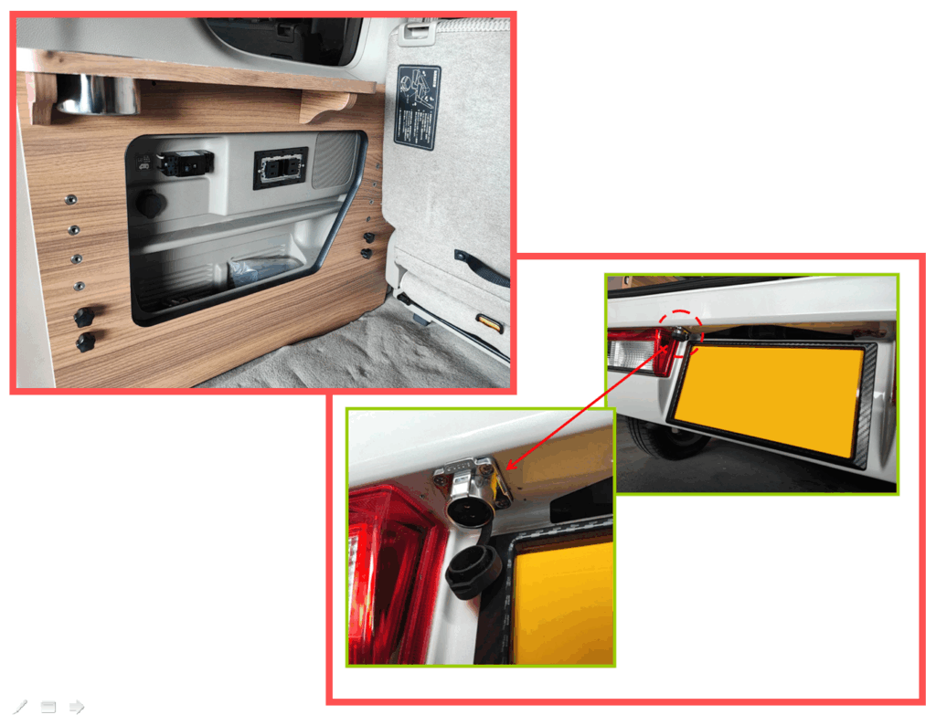 | 外部電源 | 自宅やRVパーク等で電源を確保する方法です。外部差込口(車側)と外部電源を専用のコードで繋ぐことで、車内のコンセントが使用出来ます。電力の大きな家電類(電子レンジ等)も心配すること無く使用することが出来ますが、使用出来る場所は限られます。 |