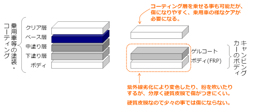 根本的な違いとして、乗用車等の一般的な車はボディに①下塗り層②中塗り層③ベース層④クリア層⑤コーティング層とあり、紫外線や汚れなど外気要因から守られています。それに対してキャンピングカーの架装部は、外装(FRP製品)作成時に流し込むゲルコート(ジェル状の樹脂)のみになります。もちろんこの上にコーティング層を乗せることも可能ですが、一般的にはゲルコート層を磨き塗装したかの様な仕上げにしています。