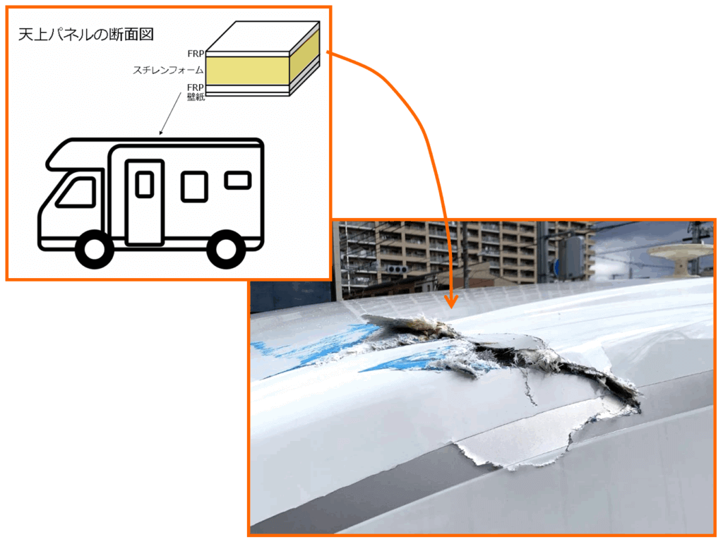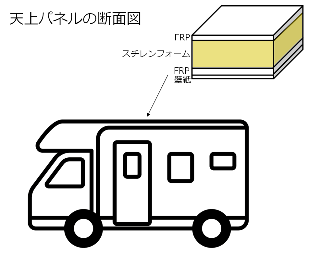 この様子ではかなりの力が加わったと思われます。キャンピングカーの外装にFRPが使用されていると言う話は前項で起筆させていただきました。実際の天上パネルをイメージ図にするとこの様な感じになります。