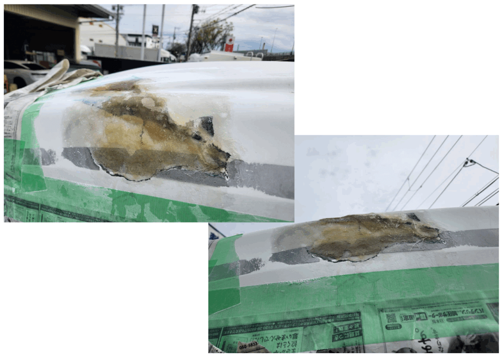 今回お預かりしたマンボウは、大きな傷がルーフに出来てしまっています。お客様のお話しでは大きな枝に気ずかすガガ ガリガリ!!…と接触したとのことで、かなりひどい傷です。ガラス繊維が目視ではっきりわかる状態です。