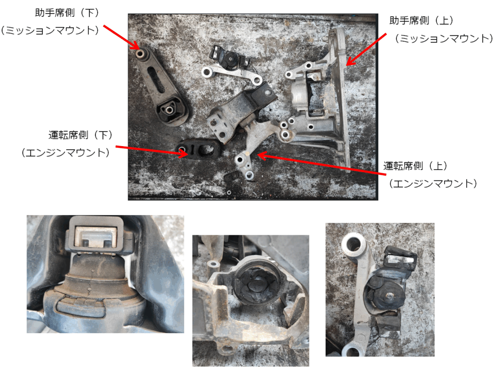 エンジンマウントはゴム製の為、経年劣化すると破断したり潰れたりします。その結果振動や異音が発生します。 |