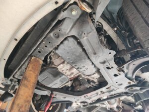 メンバーの取付けボルトを外して、クロスメンバーとアームの間に入れます。元通りボルトを締めてジャッキを下ろせば完成です。ウレタンワッシャーがスペーサー的な役割を担ってくれて異音を吸収してくれます。