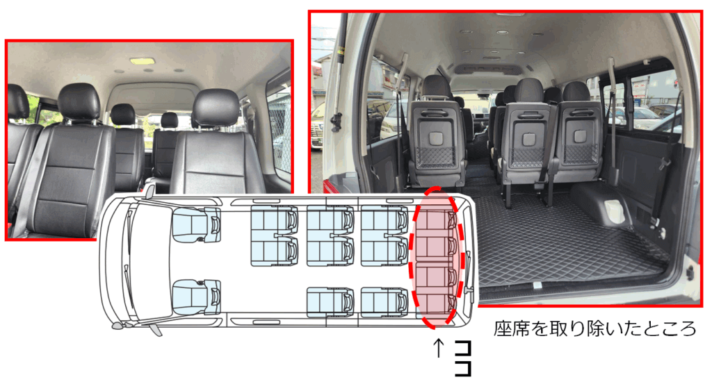 重要な事は、最後列の座席を外した事で乗合から乗用になりましたので、「乗用自動車の安全基準の内容」を満たす必要があると言う点です。