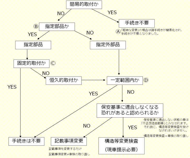 自動車部品の取付けについて、「軽微な変更」の場合は構造等変更に係わる諸手続きが簡素化され、1995(平成7)年から諸手続きが不要になりました。なお、軽微な変更となる自動車部品を装着した状態においても、道路運送車両の保安基準に適合している事が必要であり、ユーザの責任において管理しなければなりません。