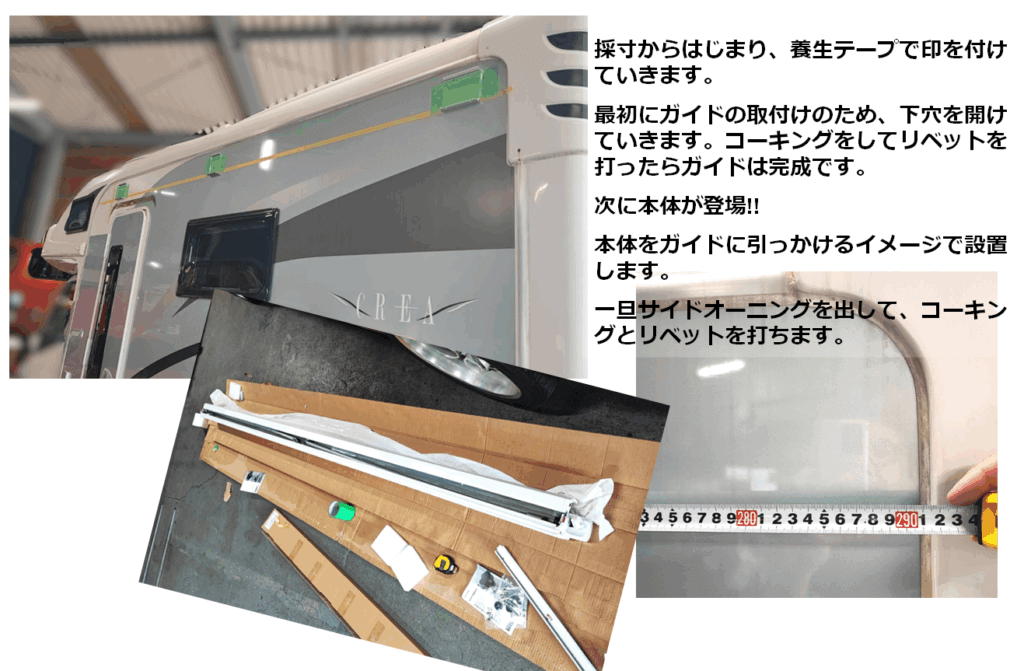 一度サイドオーニングを出します。コーキングとリベットを打ったら施工は完成です。