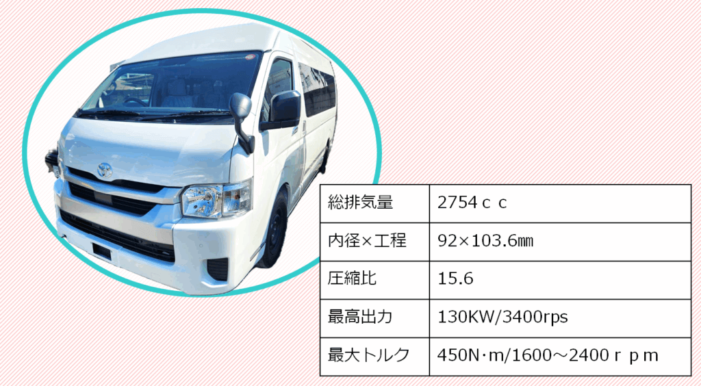ハイエースは大変ポテンシャルが高い車です。その為基本的な改造(足廻り等)を行う事無く、自分仕様の構造変更が可能です。また今回お預かりしたハイエースに搭載されている1GDディーゼルエンジンは世界トップレベルの最大熱効率を達成しています。簡単に言えば燃費が良いという事ですが、多くの国で愛されているハイエースはあらゆる国の環境に対応しているとも言いかえる事が出来ます。パワフルでエコ、進化したディーゼルエンジン、それが1GDです。1GDエンジンはハイエースの他にもランドクルーザープラド・イノーバ・フォーチュナ・ハイラックス等にも搭載されています。