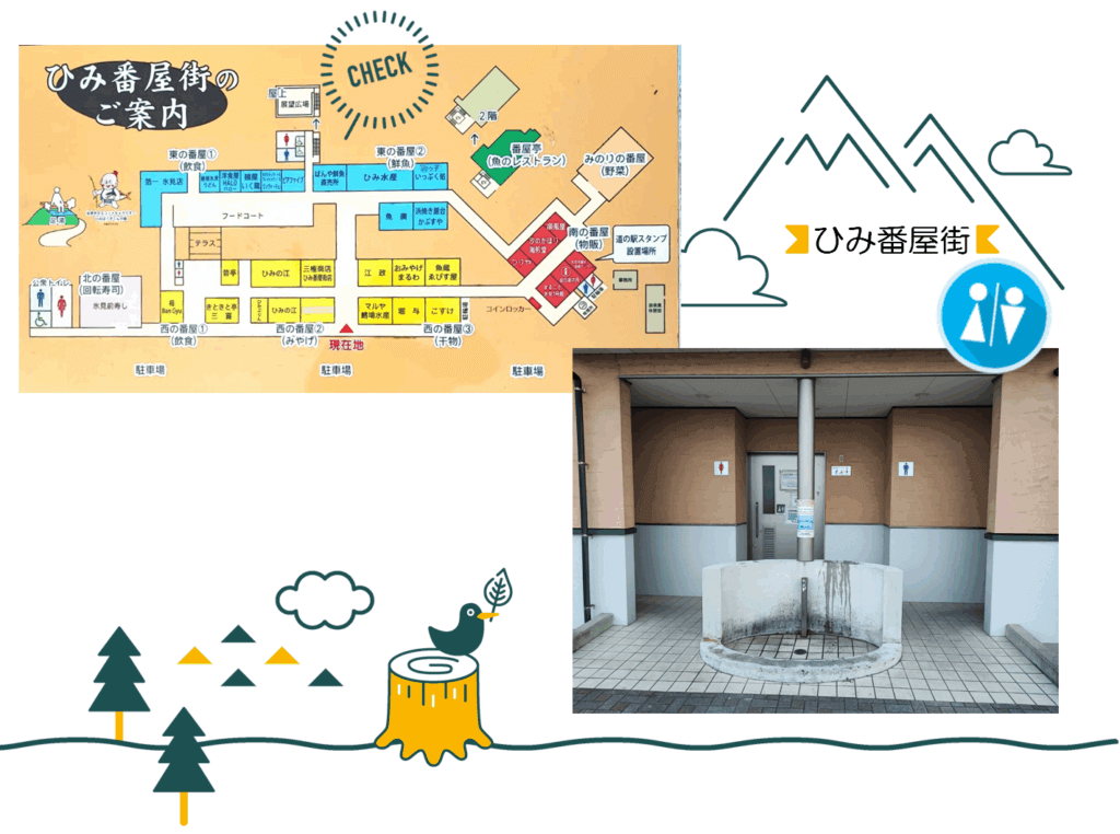 - 東の番屋(飲食)近くには男女別々のトイレと多目的トイレがあります。