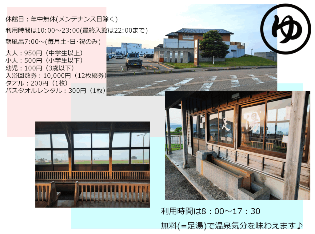 総湯(温泉)の敷地内にも駐車場(90台)がありますので、移動も楽々です。また総湯内にも食事をする施設があり温泉を利用しないお客様がお食事だけ利用する事も可能とありますので、氷見ならではの魅力を色々な形で満喫する事が出来るのではないでしょうか。