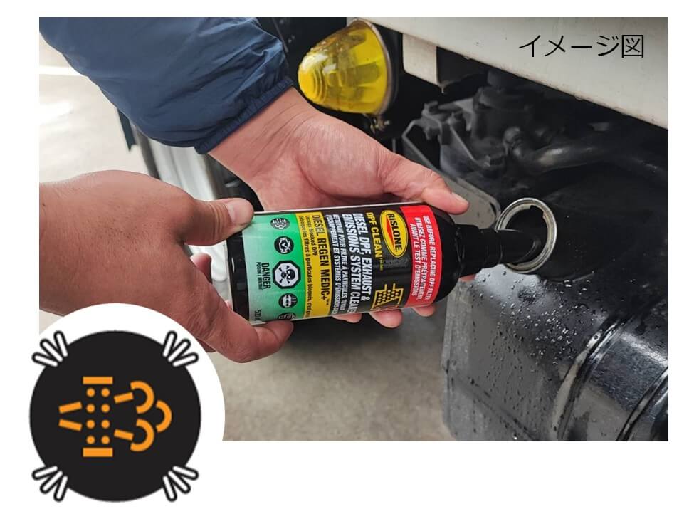 | 手動再生 | チェックランプが点灯した際、一旦車を路肩に停めます。高回転でアイドリングを行い、インジケーターランプ、DPFボタンを押して手動再生を行います。 |