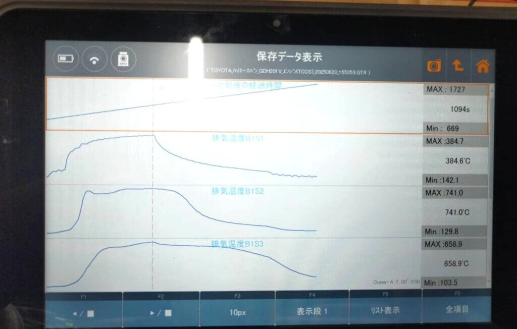 まずは診断機にかけて数値を確認してみます。燃焼温度が上がりきっておらずススを焼き切る温度に達していません。車の型式によって違いますが、ハイエースは排気温度を上げる為にPM再生時にターボ近くのフューエルアディションインジェクターが排ガス中に燃料を噴射する仕組みになっています。温度が上がらないという事は、燃料が噴射されていない可能性が高いと見通しを立てる事が出来ます。