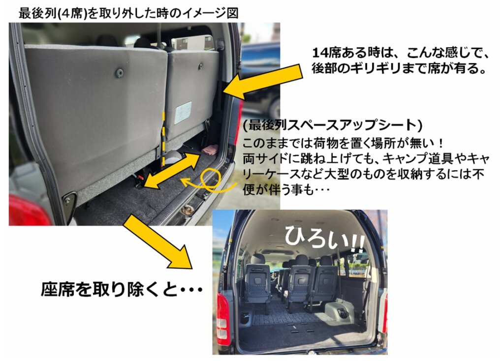GLは最後列が跳ね上げシートになりますので、格納している状態であればある程度スペースが有りますが、荷物を出し入れする度にシートを格納したり元に戻したりという手間が発生します。跳ね上げたシートの分だけどうしてもスペースが狭くなりますので、最後列の4席を取り外す事で広い荷室を確保する事が可能になります。