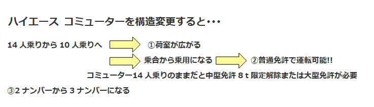 コミューターはそのままの場合2ナンバーになります。2ナンバーは毎年車検を受ける必要がありますが、ナンバー区分が変わる(3ナンバーになる)事で、車検が2年に一度に変更になります。お車を維持する上では大きなメリットと言えます。但し、自動車重量税は3ナンバーの方が高くなりますので、車検にかかる費用以外にも保険代や高速代等トータルで計算してみる必要があります。