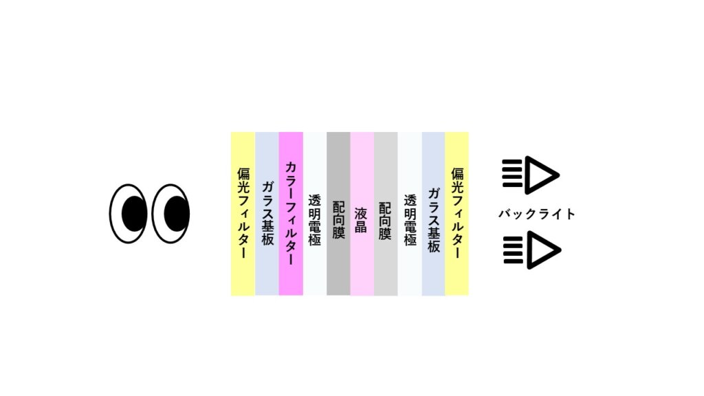 液晶パネルの日焼けによって文字が見えなくなる理由は、メーター内に内蔵してある偏光パネル(偏光板)が劣化しているからです。 まずは変更パネルについて説明します。まずそもそも、私たちが見ている液晶はこんな仕組みになっています。