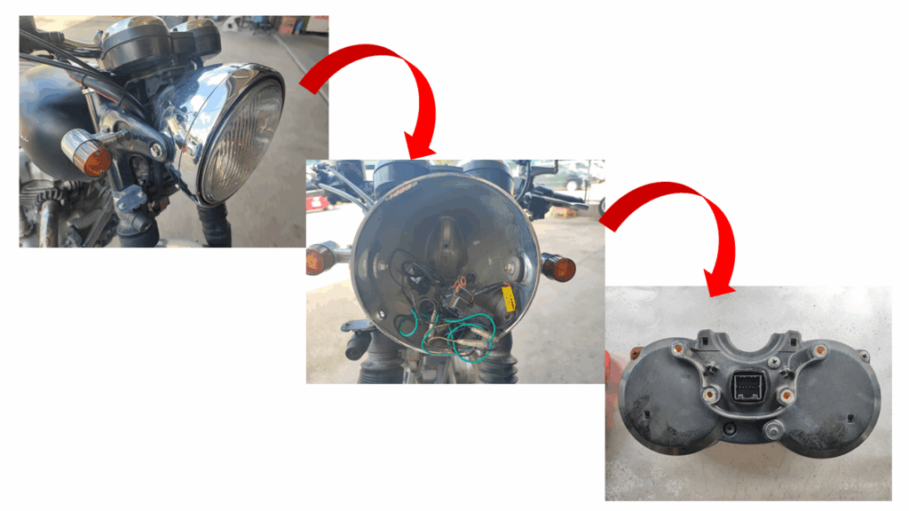 ではここから修理に入っていきましょう! バイクのメーターを外すにはまずライトをガパッと外して線も外していきます。