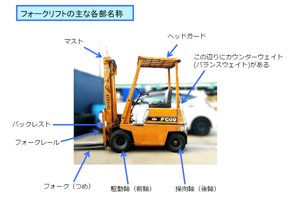 | 車体構造・安全装置(支える・守る) | 自動車はサスペンションで衝撃吸収し、4点(4輪)支持で横転しづらい構造ですが、フォークリフトは3点支持構造で、カウンターウェイトでバランスを取るようになっています。小回りはきくが転倒しやすいという短所があります。 |