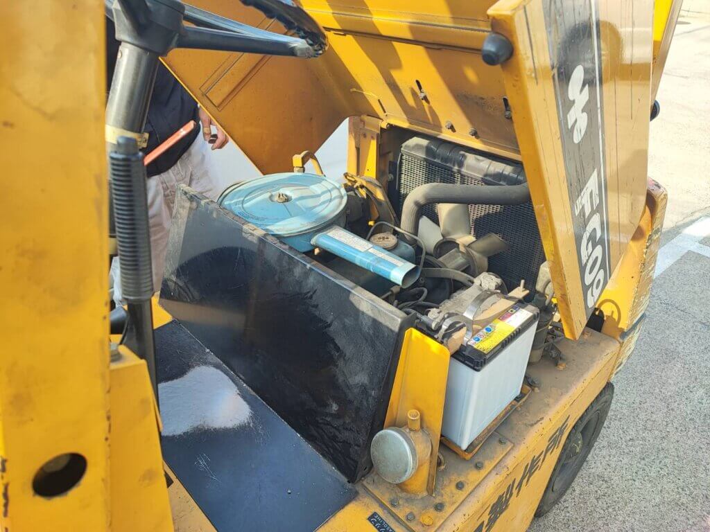 今回お預かりしたフォークリフトもガソリンエンジンですが、年季の入ったベテランフォークです。最大荷重900㎏の小型フォークリフトですが、黒煙がひどく構内での作業に支障があるので見て欲しいとのご依頼を頂戴しお預かりいたしましたのでまとめたいと思います。