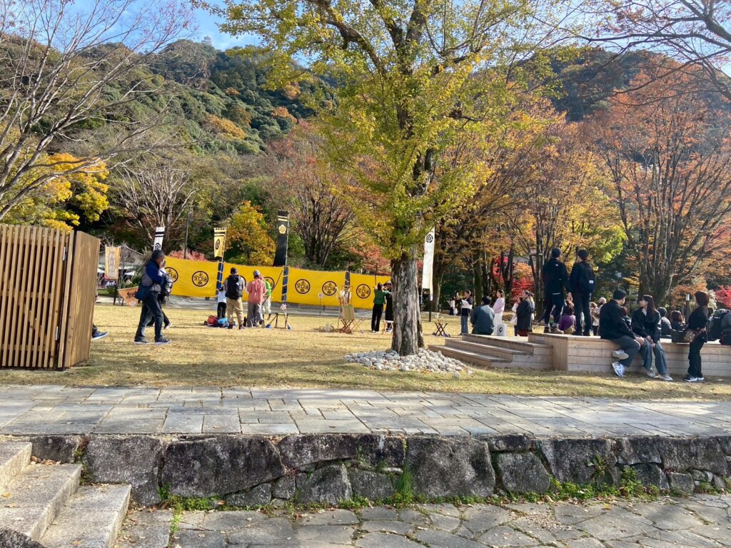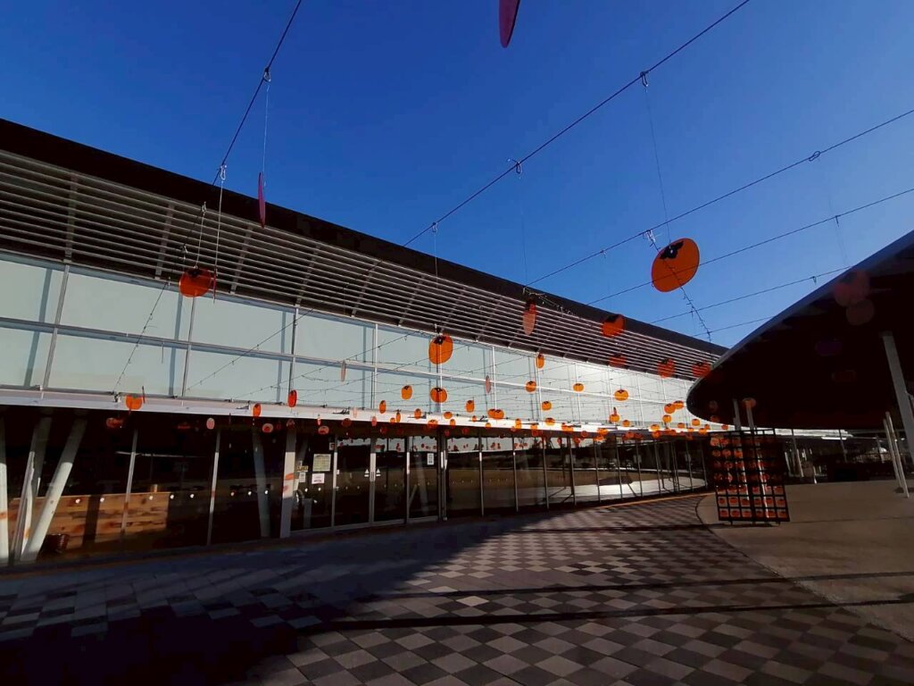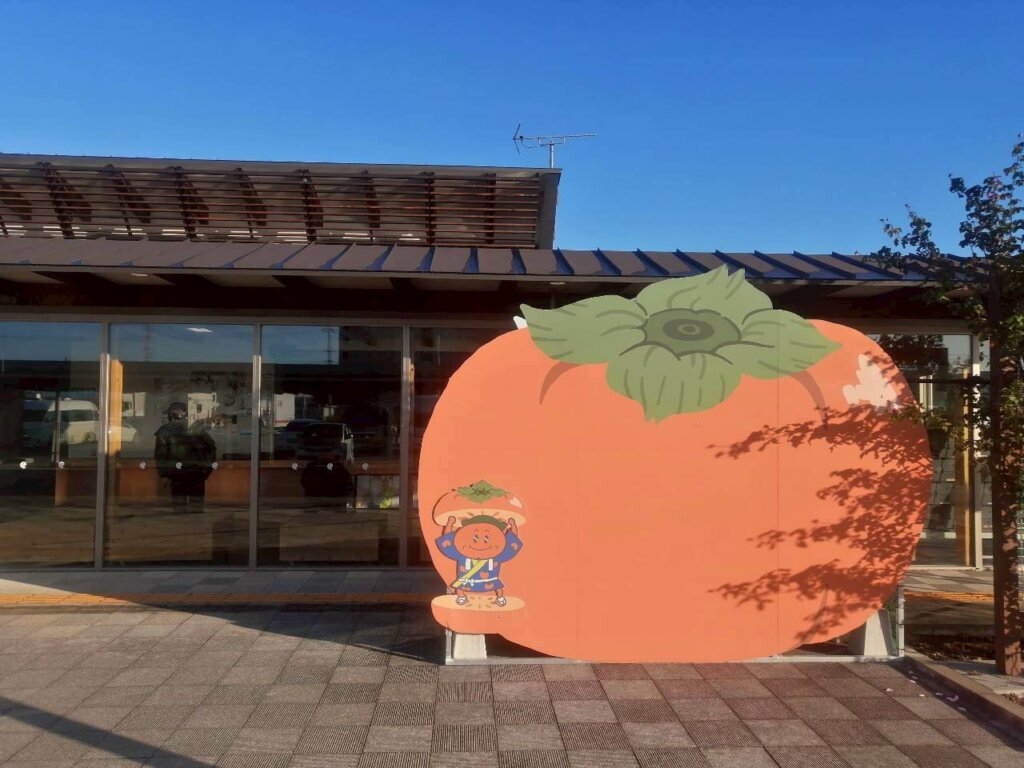 道の駅パレットピアおおのは、広大な芝生広場と開放感のある建物が印象的な道の駅です。建物前には季節装飾(訪問時は柿をモチーフにした装飾)が施され、地域色が感じられる雰囲気づくりがされています。