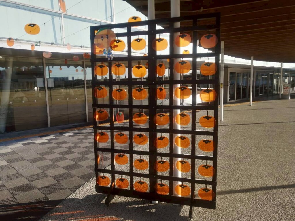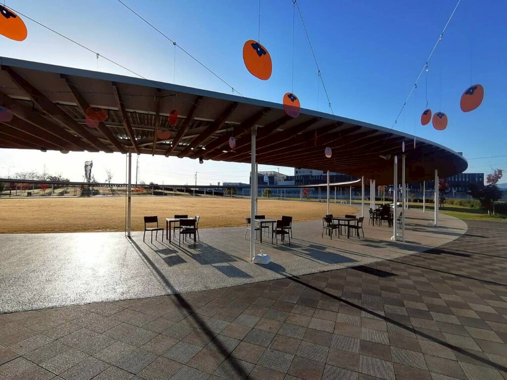 訪問時には柿をモチーフにした装飾が施され、地域の特色が感じられました。広い芝生広場との一体感もあり、圧迫感がなく開放的な印象です。