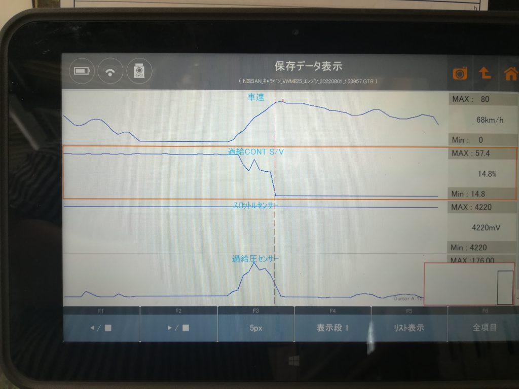 過給圧の異常コードが確認された事と、実際の吸気の流量の数値に異常がある事が確認出来ました。