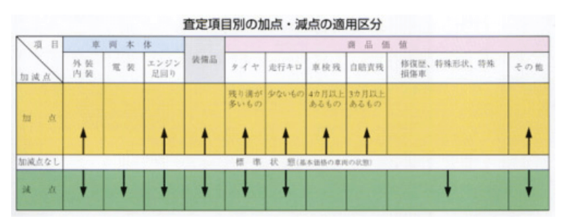 このモノサシに照らし合わせて、該当中古車の状態を比較し、各項目において加点減点する事になります。