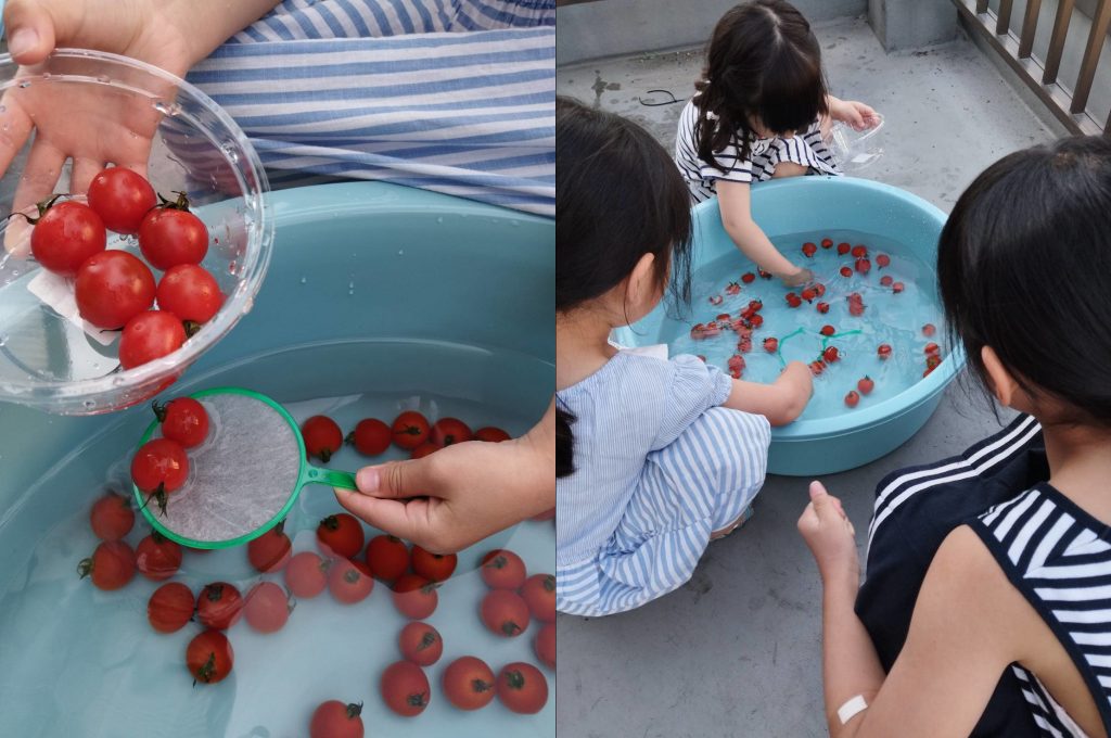 ○ たらいで「トマトすくい」 ![]() | 何個採っても100円! ポイが破れるまでたくさんとってくださいね! お子さまが喜ぶこと間違いナシ (≧▽≦) |