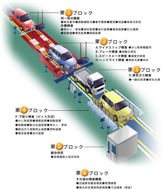 | ・同一性の確認 ・サイドスリップ検査 ・ブレーキ検査 ・スピードメーター検査 ・ヘッドライト検査 ・排気ガス検査 ・下回り検査(ピット方式) |