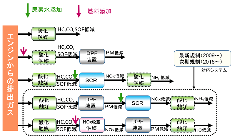 ディーゼル車の車種や排気レベル等に応じて、上記の排気後処理装置が組み合わされて使用されています。